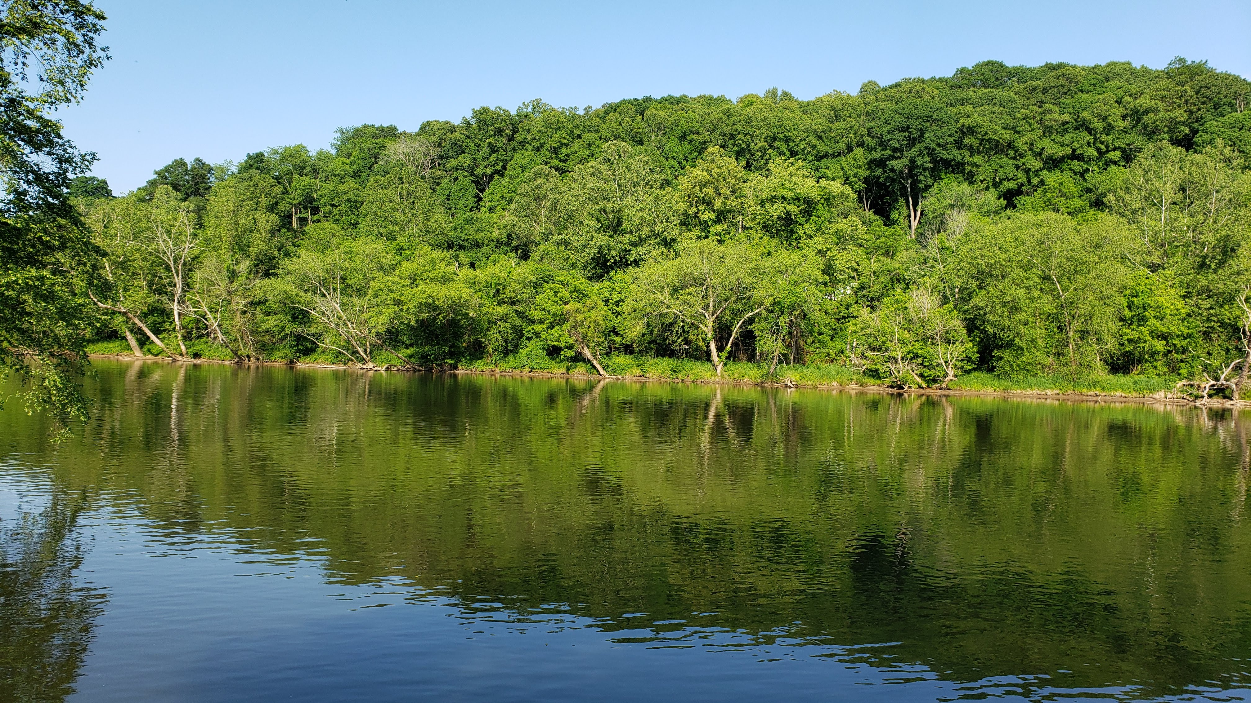 This riverside space features paved trails, a scenic overlook, open areas for play & a dog park.